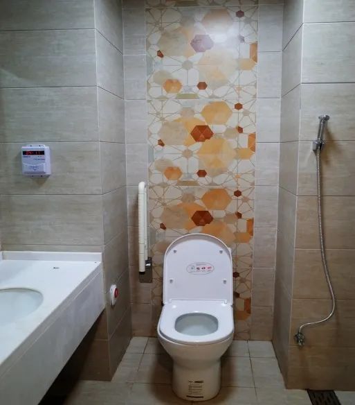 病区卫生间采用干湿分区,为了产妇、儿童的安全,淋浴间地面采用拉槽防滑处理,坐便器旁安置紧急呼叫按钮。除此之外,还设置污洗龙头,做到洁、污分开。真正将人性化设计落到实处。