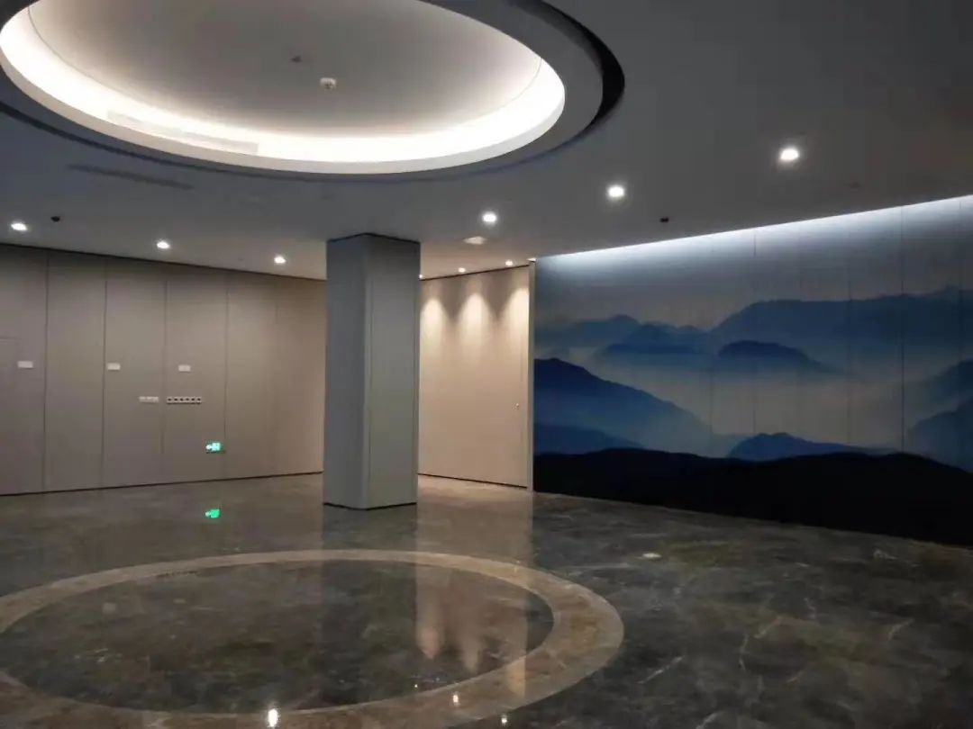 大楼主入口设置了铝合金除泥垫,保持室内空间的症结,更具人性化。主入口的背景采用了以“星空下,山水间”为主题的造型墙,把设计概念落实到实处。大厅等候区采用多元化的家具组合形式,让空间更加生动。