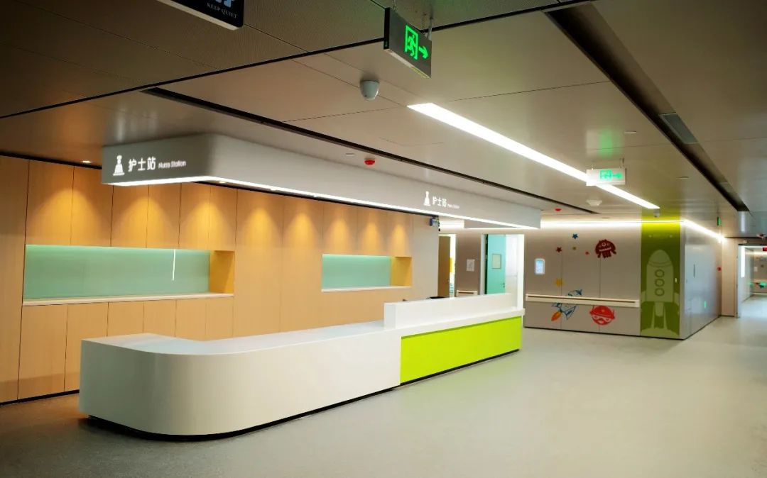 产科病房和儿科病房的墙面一改以往单调的色调,以红、绿、蓝、黄等色彩使室内空间五彩斑斓,儿科病房的墙面印刷上了许多的卡通图案,使之既色彩丰富,又迎合了产科温馨、儿科活泼的要求。